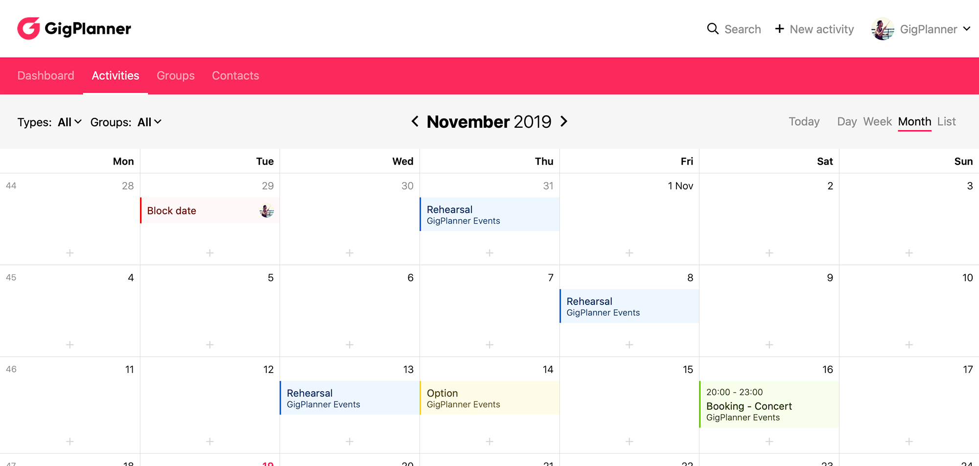 Session musicians and freelancers who play in multiple groups can automatically share availability information between the groups. When you have an activity with one group, the other group will automatically see a blocked date for this period.